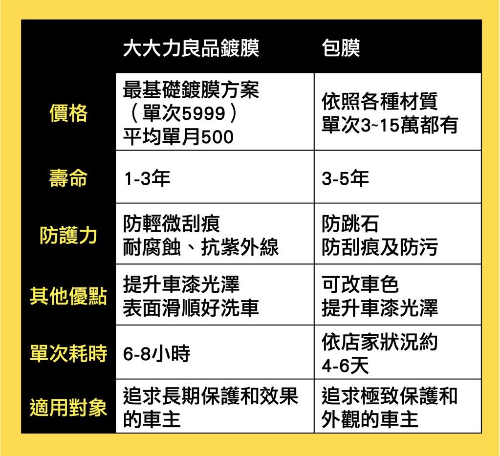 目前大大力提供多種鍍膜方案:一年期$5,999、二年期$8,999、三年期$11,999起,7人座及皮卡只需+$1,000,上述說的施作範圍及套裝內容皆含在內。各方案的差異是:使用的藥劑、施作層數及保固年期皆不盡相同,有興趣可以[直接加🔗官方LINE私訊我們]了解更多詳情!
